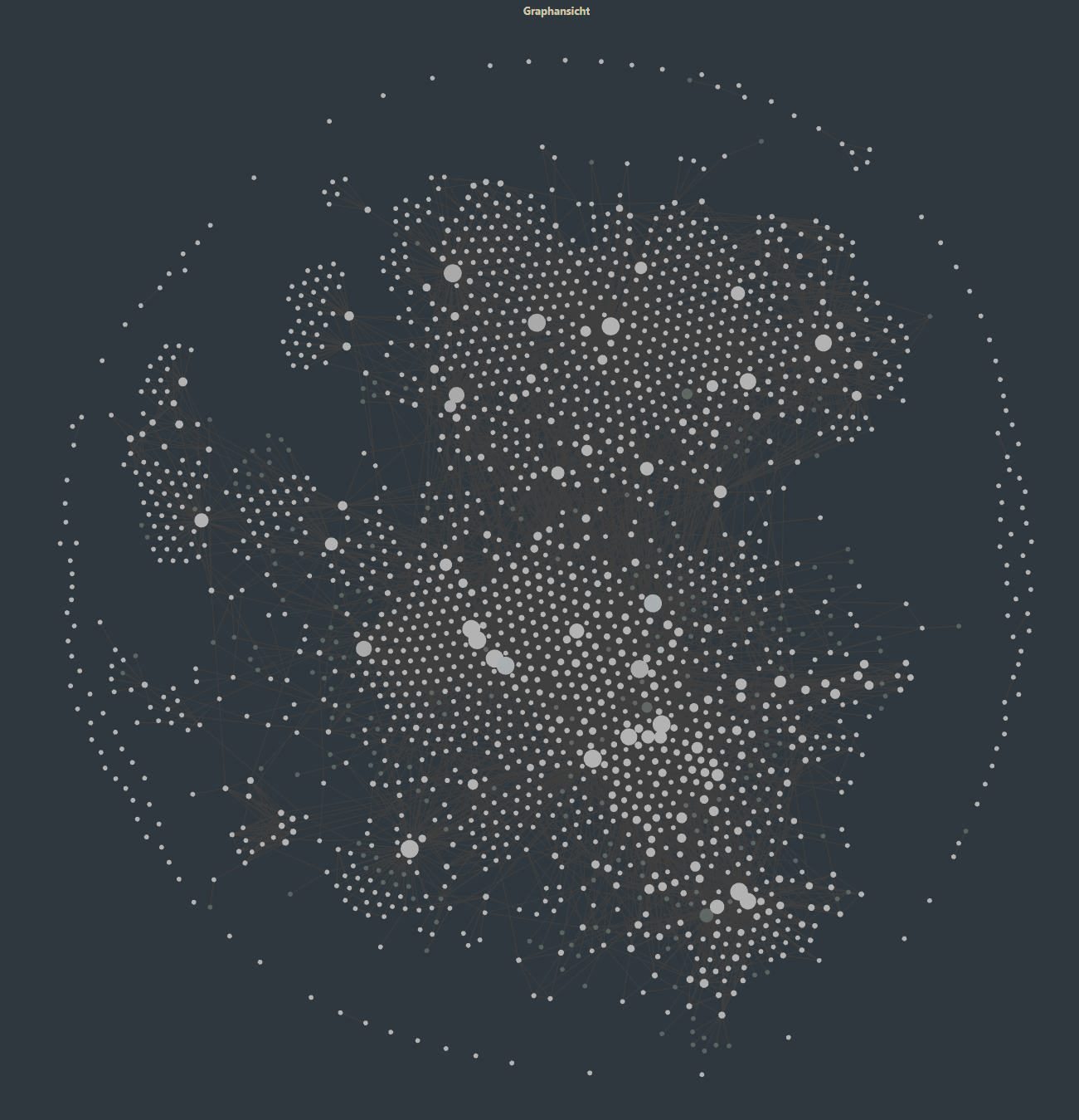 Ich habe aktuell 1926 einzelne Notizen in meiner Vault. Mal enthalten sie mehr, mal weniger Text. Obsidian stellt jede Notiz als kleinen Punkt dar und je mehr Verlinkungen von dieser Notiz ausgehen (oder zu ihr verlinken), desto größer wird der Punkt.